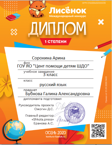 Диплом Сорокиной Арины 3 класс по русскому языку