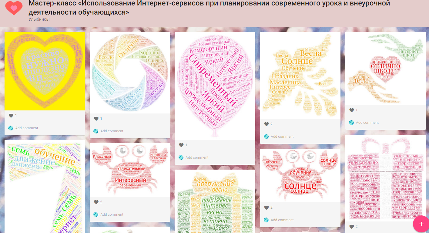 В конце обучения была проведена рефлексия. Участники мастер-класса записали свои ассоциации на облако слов и добавили "облака" на виртуальную доску.