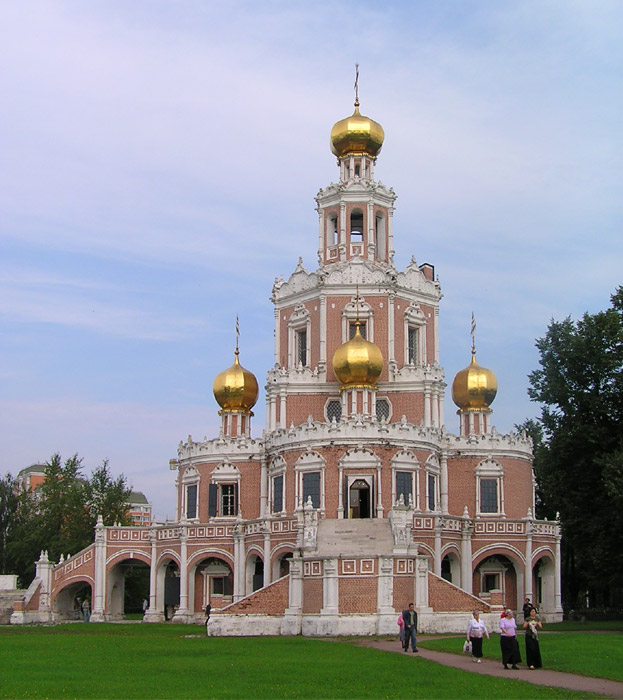 К концу XVII века в русской соборной архитектуре появился новый стиль, названный нарышкинское или московское барокко (по имени заказчиков бояр Нарышкиных). Этот стиль отличали яркость фасада, контрастное сочетание в нем красного и белого цветов, обилие раковин, колонн и капителей, украшавших стены, "многоярусность" построек, заимствованные из светской архитектуры. Примерами московского барокко служат церковь Покрова Богородицы в Филях, трапезная и колокольня Новодевичьего монастыря.