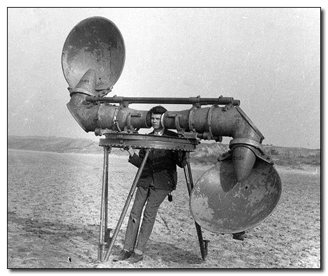 Ещё один интересный факт Второй мировой войны. Как ни смешно это выглядит, но это действительно большие уши. Этот парень не отдыхает, а слушает небо. Лучшего способа услышать шум двигателей бомбардировщиков тогда не было. В этой установке нет ничего высокотехнологичного, Вы просто подключаете гигантский конус в ухо и слушаете звук немецких летчиков и самолетов. Элегантно, эффективно и просто.